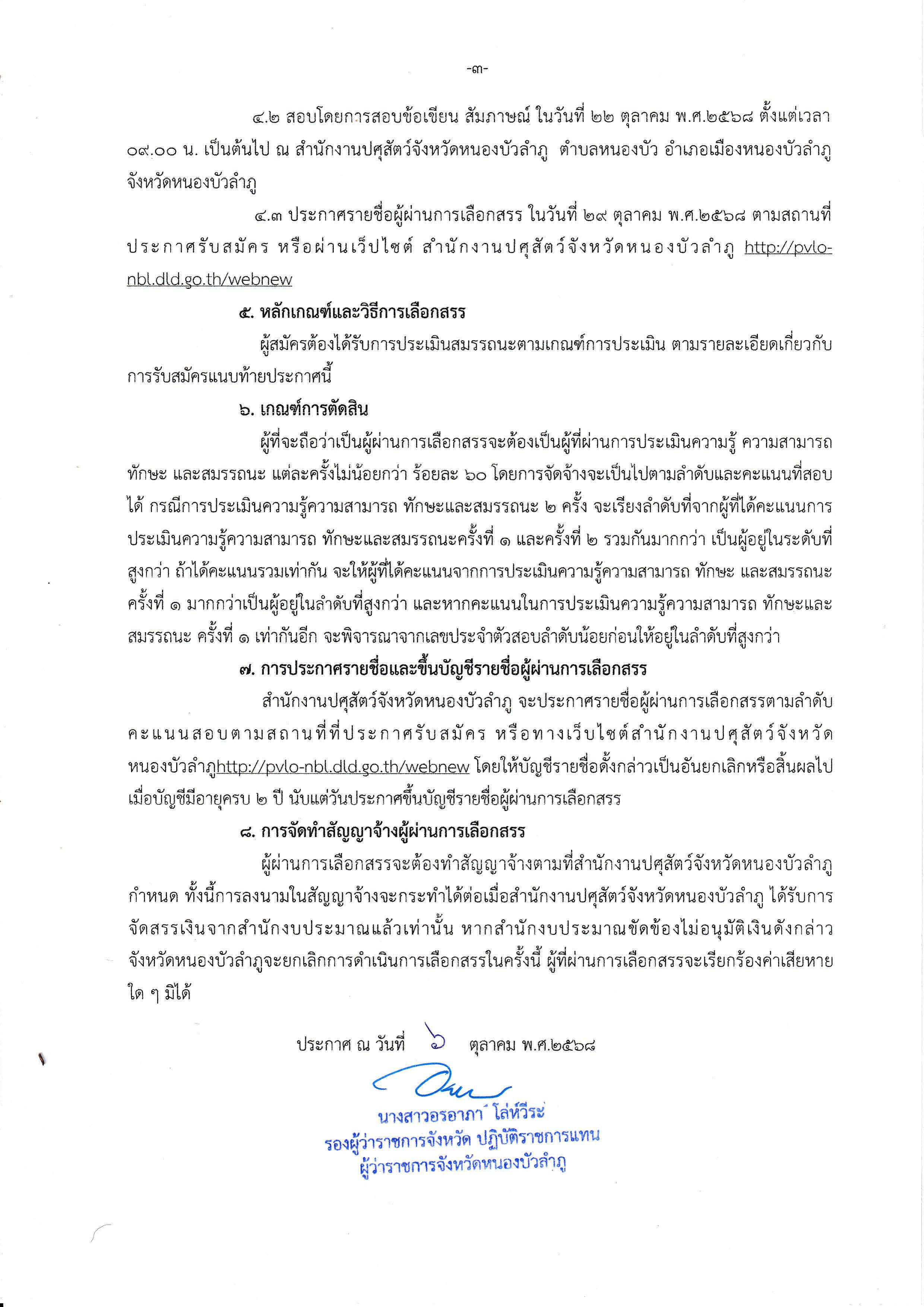 นที่ ๔ กรกฎาคม พ.ศ. ๒๕๖๘ เวลา ๐๘.๓๐ น. นางวัลลภา วราอัศวปติ ปศุสัตว์จังหวัดหนองบัวลำภู มอบหมายให้เจ้าหน้าที่สำนักงานปศุสัตว์จังหวัดหนองบัวลำภู และสำนักงานปศุสัตว์อำเภอทุกอำเภอ พร้อมด้วยศูนย์วิจัยและพัฒนาอาหารสัตว์ อุดรธานี ร่วมดำเนินโครงการปศุสัตว์ร่วมใจกำจัดภัยโรคพิษสุนัขบ้า เพื่อเฉลิมพระเกียรติ ศาตราจารย์ ดร. สมเด็จเจ้าฟ้าฯ กรมพระศรีสวางควัฒน วรขัตติยราชนารี ภายใต้โครงการสัตว์ปลอดโรค คนปลอดภัย จากโรคพิษสุนัขบ้า ตามพระปณิธานฯ ปีงบประมาณ พ.ศ. ๒๕๖๘ ณ โรงเรียนถ้ำช้างอินทร์แปลง ตำบลวังทอง อำเภอนาวัง จังหวัดหนองบัวลำภู ผลการปฏิบัติงาน ทำหมันสุนัขและแมว รวม ๖๐ ตัว และฉีดวัคซีนป้องกันโรคพิษสุนัขบ้า ๑๐๐ ตัว รวมถึงการให้คำปรึกษาเกี่ยวกับการดูแลสุขภาพสัตว์เลี้ยงร่วมด้วย